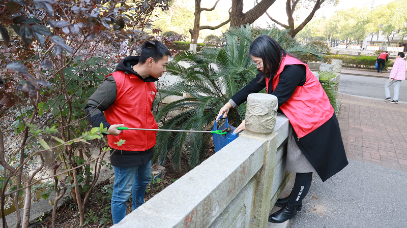 活动中,党员志愿者们充分展现了不怕脏、不怕苦、不怕累,敢于冲在前面、敢于抢挑重担的精神风貌。向阳湖内侧绿化带因有石板护栏隔离,存在多处卫生死角,清理垃圾非常不便。年轻党员志愿者主动认领任务,迅速组团配对,有的爬过护栏跳入绿化带内进行清理,有的在旁传递垃圾袋,有的一手提着垃圾袋,一手拿着垃圾夹子,对蓉园路沿线及南海宾馆前坪的塑料袋、烟蒂、电池、玻璃瓶等不易降解的有毒有害垃圾进行清理。
